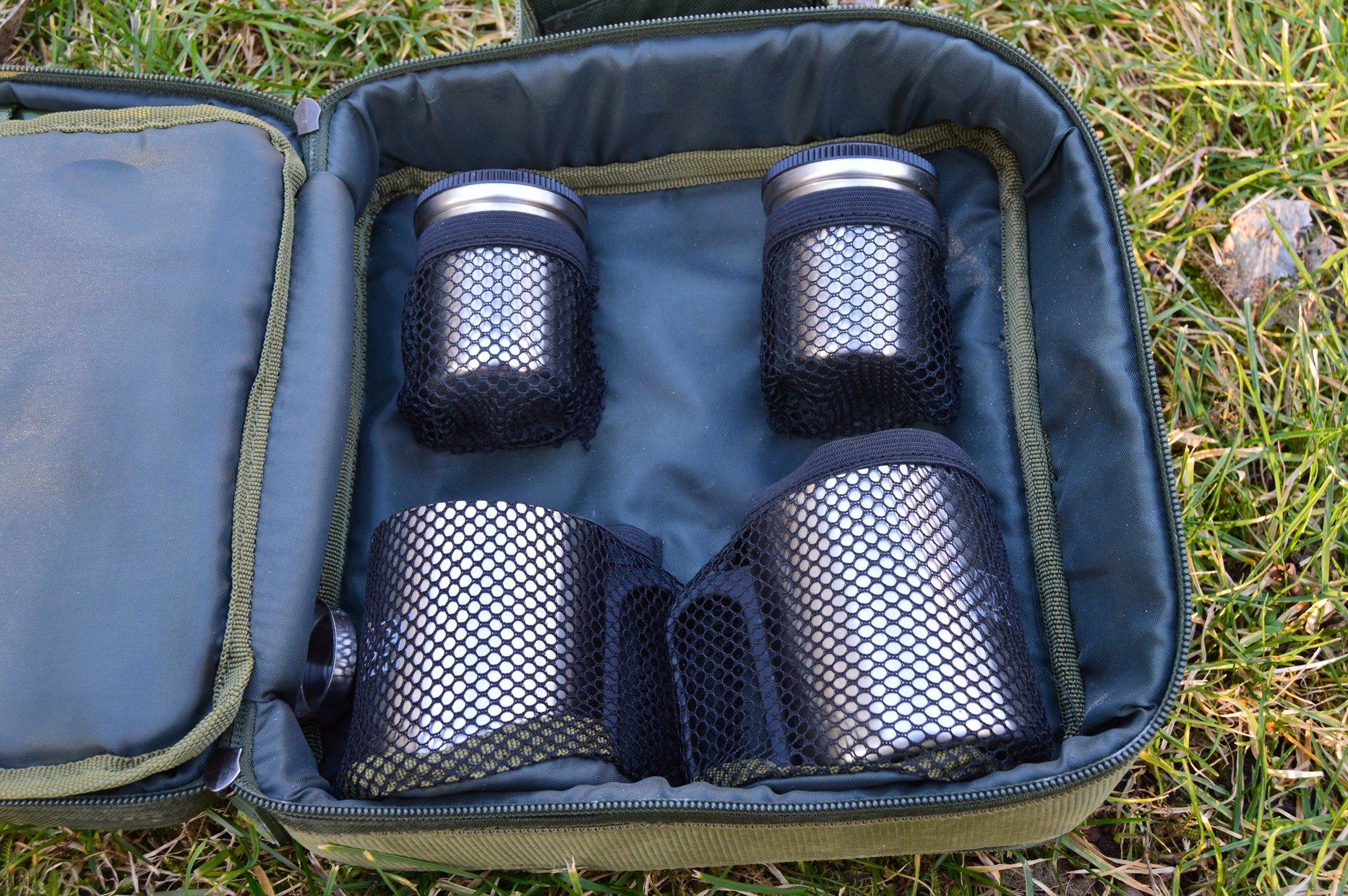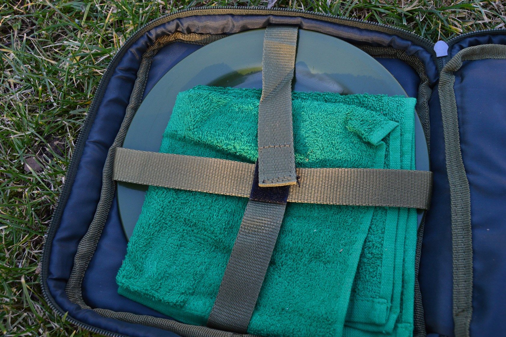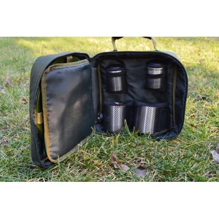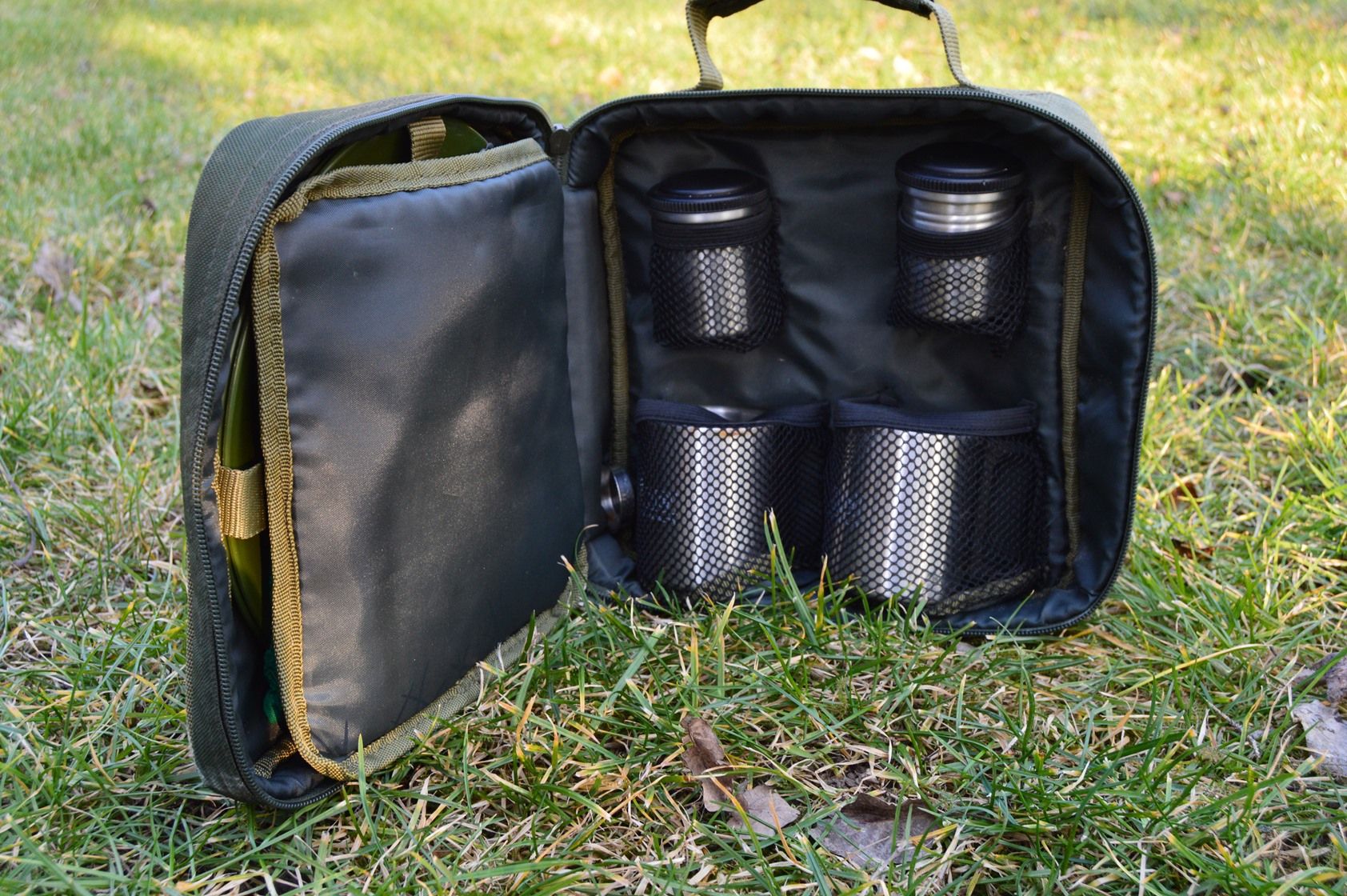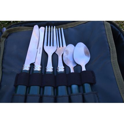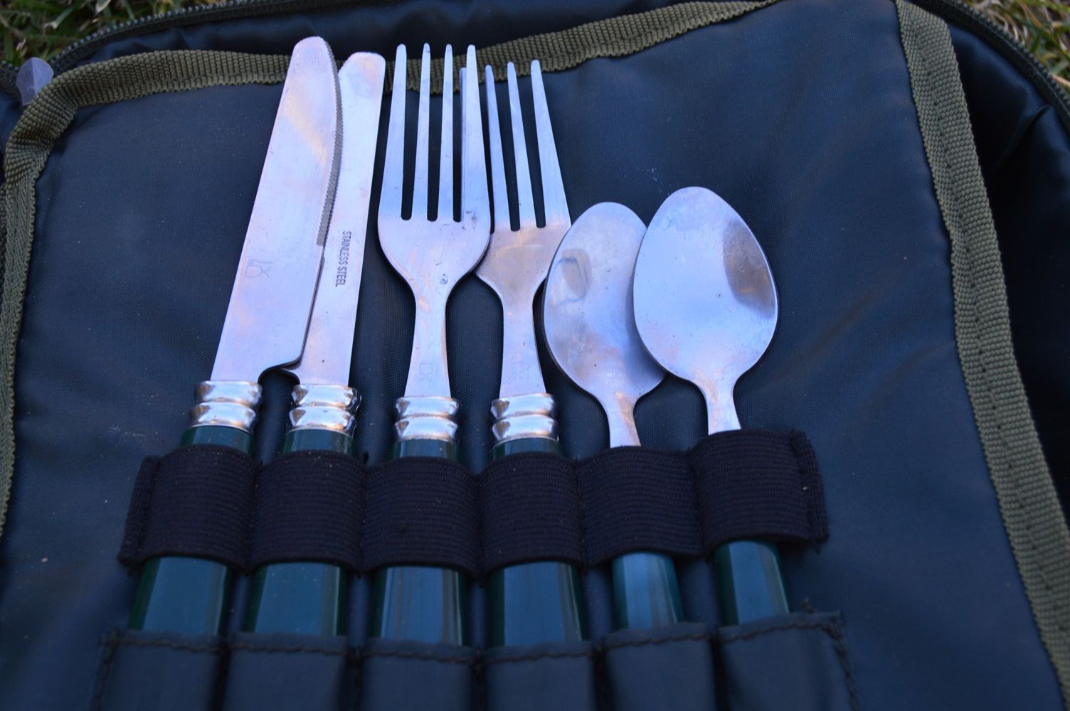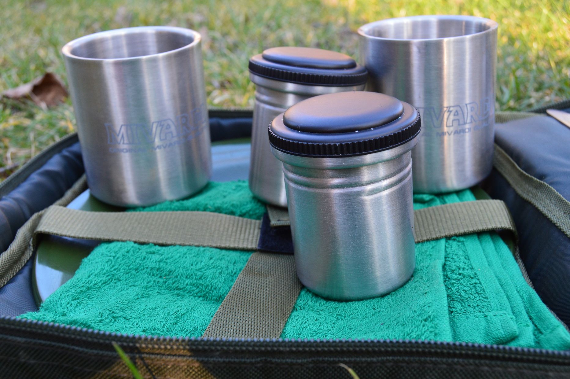 Sada kvalitního jídelního příslušenství. Obsahuje froté utěrku, talíře z velmi odolného plastu, kompletní příbory, nerezové termohrnky a nerezové dózy na cukr a sůl s kvalitním těsněním. Vše je zabaleno v kvalitním polstrovaném pouzdru se zipem a transportním uchem.