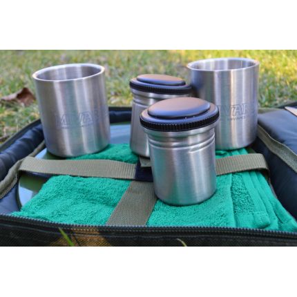 Sada kvalitního jídelního příslušenství. Obsahuje froté utěrku, talíře z velmi odolného plastu, kompletní příbory, nerezové termohrnky a nerezové dózy na cukr a sůl s kvalitním těsněním. Vše je zabaleno v kvalitním polstrovaném pouzdru se zipem a transportním uchem....