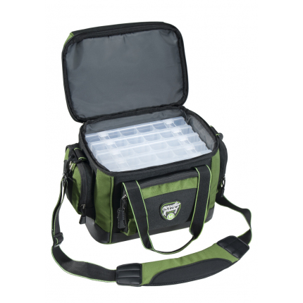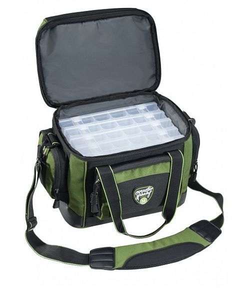 Prostorná taška na nástrahy a veškeré příslušenství pro lov na přívlač. Obsahuje 5 velkých krabiček na nástrahy. Velká kapsa ve víku a tři postranní kapsy umožňují přehledné uložení dalšího příslušenství. Popruh přes rameno s kvalitním polstrováním zaručuje pohodlné nošení.