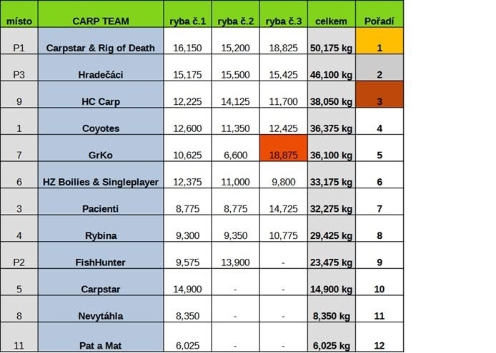 Přes celý páteční den nám pruty opět mlčely a my jsme tak pouze několik hodin opět krmili naší směsí, která se skládala z trochu partiklu, rozpustných pelet a boilies. Zalévali jsme to tekutými atraktory od firmy Carp ServisVáclavíkv a čekali na úspěch. Po setmění se opět rozjel neskutečný koncert a ryby spolupracovaly do půl hodiny po náhozu. Stále jeden a ten samý problém. Všechny ryby pouze do deseti kilogramů. Sobotní průběžné výsledky nám ukázaly, že jsme stále na 5. místě a je rozhodně o co hrát. Stačila jedna velká ryba a mohli jsme být úplně jinde. Bohužel přes celou sobotu jsme opět úplně bez záběru, a tak nezbývalo doufat, že poslední noc k nám bude štědrá a my chytneme ty správné ryby. Na začátku večera se nám podařilo chytit kapra 10,7kg, což pro nás byla první malinko lepší ryba a mysleli jsme si, že to teď v noci všechno začne. Začalo, ale opět velké množství malých ryb a my jsme další podobnou téhle nedokázali ulovit, a tak jsme věděli, že se pravděpodobně dost propadneme, protože bylo vidět, že se ryby poslední noc docela dost chytají.