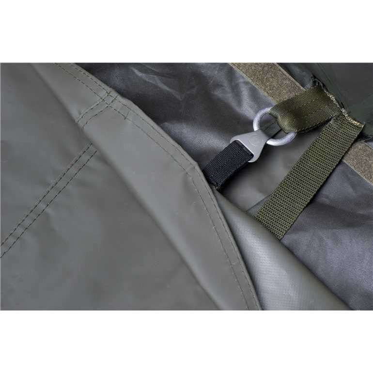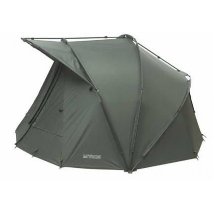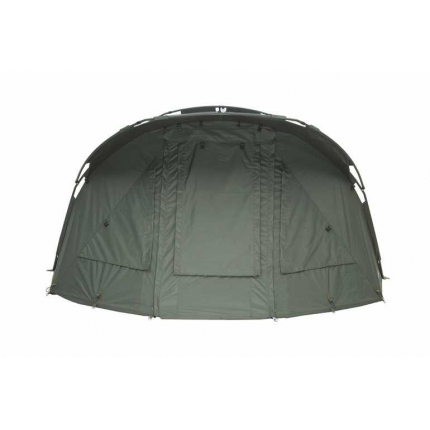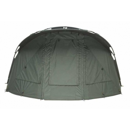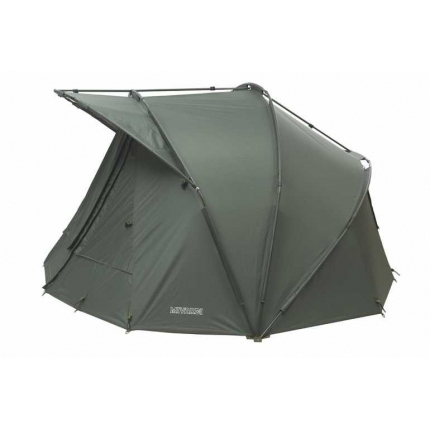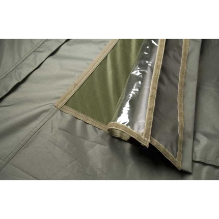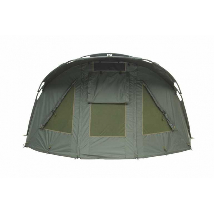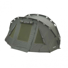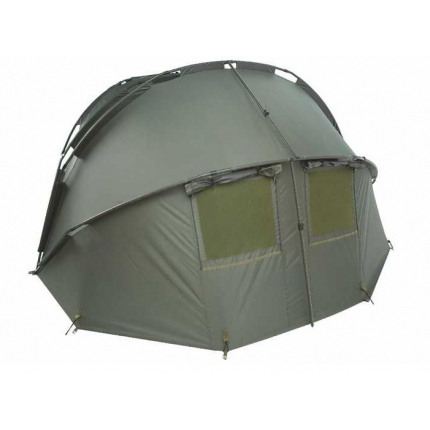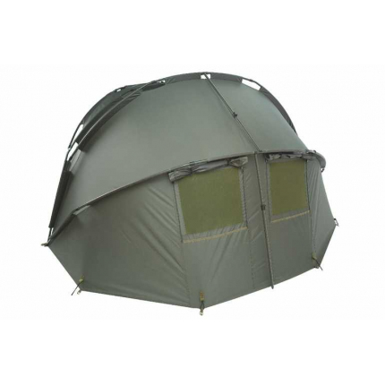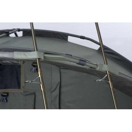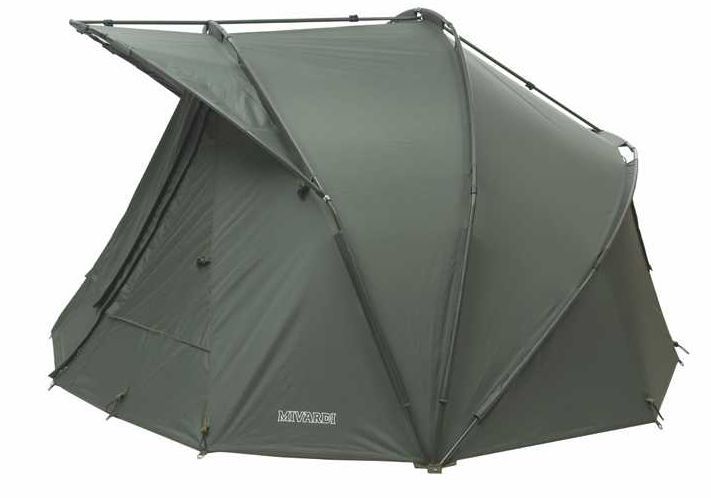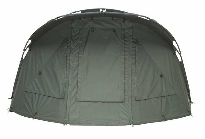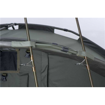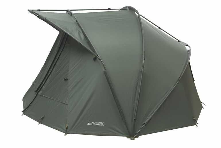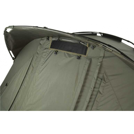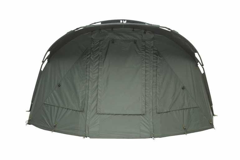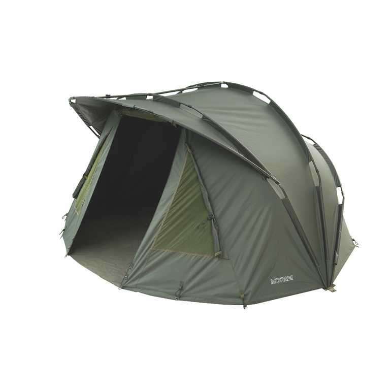 Luxusní velkoprostorový bivak z extrémně odolného materiálu M-Tec 410 s vodním sloupcem 10000 mm. Mimořádnou kvalitu a tloušťku materiálu rozeznáte prvním pohledem nebo dotykem a snadno je odlišíte od většiny standardních bivaků na trhu. Konstrukce z 19 mm zesílených trubek vychází z klasické podoby bivaku s předním „kšiltem“, avšak prošla řadou úprav. Prodloužená stříška chrání celou plochu dveří. Ve vnitřním prostoru s výškou 160 cm najdete 10 úchytů pro světla a další drobné příslušenství. Šířka bivaku je variabilně nastavitelná ve třech polohách. Podlahu je možno uchytit suchými zipy po obvodu bivaku a dvěma kovovými klipsnami po stranách. Dveře jsou vybaveny otvíratelnou ventilační klapkou pro zajištění cirkulace kyslíku a odvedení vlhkosti z bivaku. Zesílené zipy jsou doplněny velkými táhly Easy Grip, do kterých lze vložit chemická světla. Vpředu jsou umístěny 4 úchyty na pruty, opřené o bivak.