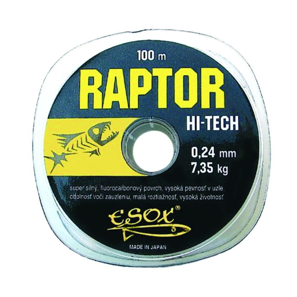 Raptor Hi-Tech je vlasec uznávaný i mezi odborníky jako jeden z nejlepších produktů na trhu. Při jeho výrobě byl použitý úplně nový proces zpracování speciální suroviny, kontrolovaný do nejmenších detailů. Vlasec má fluorokarbonovou povrchovou úpravu, díky čemuž je výjimečně hladký a téměř voděodolný. I po namočení si tedy udržuje téměř celou svou sílu, která u mnohých běžných vlasců klesá až o 15%.