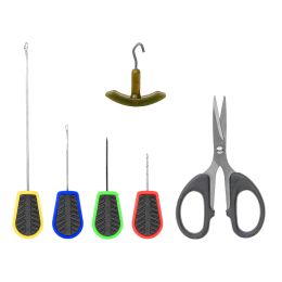 Praktická sada sestávající ze tří různých navlékacích jehel, vrtáku na boilies, testovače a utahováku uzlů a praktických nůžek. Navlékací jehly jsou v provedení s ochranným krytem. Nůžky jsou určeny na stříhání vlasců, ale i splétaných šňůr. Je to praktická pomůcka, která by neměla chybět ve výstroji žádného rybáře. Výrobce Carp Zoom