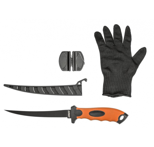 Jedná se o sadu složenou z filetovacího nože, brusky na nože a rukavice odolné proti proříznutí. Extra ostrá čepel z nerezavějící oceli je flexibilní a dostatečně dlouhá pro filetování ryb s větším tělem. Bezpečné uložení nože zajišťuje plastové pouzdro s klipem, který zabraňuje vyklouznutí nože. Bezpečnost těch méně zkušených rybářů při práci v kuchyni je zaručena rukavicí s odolností proti proříznutí. Doporučujeme rybářům, kteří mají rádi gastronomii. - Délka čepele: 175 mm - Délka rukojeti: 130 mm Výrobce: Carp Zoom