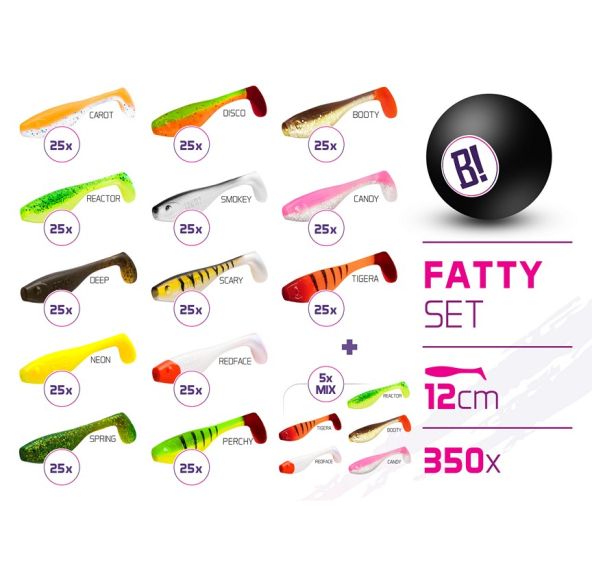 Fatty je hrdým nositelem svého jména. Tato umělá nástraha se vyznačuje tučným tělem, které je ukončeno poměrově štíhlým ocasem. Právě ten ve vodě neskutečně provokuje smysly všech číhajících dravců. BOMB! Fatty je dokonale zpracovanou nástrahou. Preciznost samotných detailů, včetně jemně strukturovaného povrchu těla je bezchybná. Díky široké nabídce těch nejúčinnějších barevných variací je Fatty tím pravým kladivem na přívlačový lov. Určitě oceníte i samotný materiál nástrahy. Ten je dokonale elastický, příjemně měkký a díky své houževnatosti i neuvěřitelně odolný a trvanlivý. To zaručuje nespočetné hodiny pravé rybářské euforie u vody! Tento set obsahuje: 25x BOMB! Fatty / 12cm / CAROT 25x BOMB! Fatty / 12cm / DEEP 25x BOMB! Fatty / 12cm / NEON 25x BOMB! Fatty / 12cm / REACTOR 25x BOMB! Fatty / 12cm / REDFACE 25x BOMB! Fatty / 12cm / SCARY 25x BOMB! Fatty / 12cm / SMOKEY 25x BOMB! Fatty / 12cm / SPRING 25x BOMB! Fatty / 12cm / PERCHY 25x BOMB! Fatty / 12cm / BOOTY 25x BOMB! Fatty / 12cm / CANDY 25x BOMB! Fatty / 12cm / TIGERA 25x BOMB! Fatty / 12cm / DISCO 5x TOP MIX BOMB! Fatty / 12cm / Tigera+Redface+Booty+Candy+Reactor
