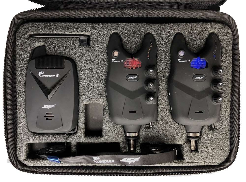 Sada v kufírku se dvěma indikátory UNICARP III a přijímač (2+1)+ zkušební baterie, popruh na krk, držák přijímače na opasek~~Nový model UNICARP III s možností volby barvy navazuje na úspěšnou řadu indikátorů UNICARP. Do jeho originálně řešeného, kompaktního a voděodolného těla byla vložena elektronika té nejlepší kvality. Dvojitá kontrola výroby nám dovoluje poskytnout tříletou záruku, což řadí tento výrobek do vyšší kategorie na trhu. Unicarp III disponuje nejen originálním vzhledem, ale řadou UNI-kátních funkcí reflektujících potřeby předních kaprařů, ale reguje i na obecné požadavky běžných rybářů např. funkce "Incognito" -indikace záběru pouze na přijímači; "Lighthouse" pro lokalizaci lovného místa při zavážení, "Alarm" proti krádeži prutů; "Drop back" funkce- zpětný záběr (padák) indikovaný na "S" LED panelu a zvukem. Celé ovládání probíhá intuitivně tak jako u předchozího modelu. Pro přehlednost byl tento model vybaven pro zapnutí a vypnutí indikátoru páčkou. Zapnutím do polohy ON na "S" panelu navíc zobrazuje podíl dílků aktuálního nabití 9V baterie. Regulace hlasitosti "V", tónu "T" a citlivosti "S" je volena klasickými potenciometry se zobrazením hodnoty na "S" panelu. Modifikace nočního osvětlení, rolničky, paměťové diody a majáku je ovládáno tlačítkem - ZICO. Tímto se značně zpřehlednila volba jednotlivých funkcí a je zcela intuitivní. Napájení je řešeno 9V baterií, která je volně dostupná ve většině obchodech, nicméně životnost baterie určuje používání indikátoru. (vzdálenost mezi indikátorem a přijímačem, používání přední zavážecí diody apod.) Na přijímač lze snadno napárovat až 6 indikátorů s unikátním kódováním. Jednotlivé indikátory Unicarp III lze párovat i na předchozí přijímač setů UNICARP (ID UNI 2, UNI 3, UNI 4) a rovněž na přijímač UNICARP II a to stejným jednoduchým způsobem. Dostupnost pro jednotlivé indikátory řady Unicarp III je docílena prodloužením antény v jeho těle a dosahuje více než 200m. Vice o jednotlivých funkcích se dočtete v návodu viz."přílohy ke zboží" Výrobek se také dodává v kufírkových sadách 2+1, 3+1, 4+1 výhodou Unicarpu III je, že nemusíte vybírat barvu do vašeho setu, jelikož na Unicarpu III lze libovolně přepínat barvy- poslední zvolená se uloží do nastavení se svojí pozicí kanálu na přijímači (max 6 barev: žlutá, zelená, modrá, červená, fialová, bílá) ~~Technické parametry Indikátoru:~- Digitální technologie řízená mikroprocesorem~- MC - multicolor~- Regulace hlasitosti 0+4 úrovně~- Regulace tónu 5 úrovní tónu~- Regulace citlivosti 5 úrovní~- Vysoká viditelnost LED diod, s možností volby jasu~- LED diody s 20 vteřinovou pamětí~- Pohotovostní režim LED diod, noční osvětlení~- Integrovaný výstup na swinger, snag s 20s pamětí~- Funkce "Incognito" -indikace záběru pouze na přijímači ~- Funkce "Alarm" proti krádeži prutů~- Funkce "Incognito" a "Alarm" současně~- Funkce "Lighthouse" pro lokalizaci lovného místa při zavážení~- Indikace nabití baterie po zapnutí indikátoru~- "Drop back" funkce- zpětný záběr (padák) indikovaný na "S" LED panelu a zvukem~- Black chrom šroub s aretací pozice silnou gumičkou~- Voděodolné a pogumované tělo indikátoru~- Provozní frekvence pro bezdrátového vysílání: 433MHz, dosah 200m~- Provozní napětí: 9V (zkušební baterie 9V je součástí výrobku)~~3 roky záruka