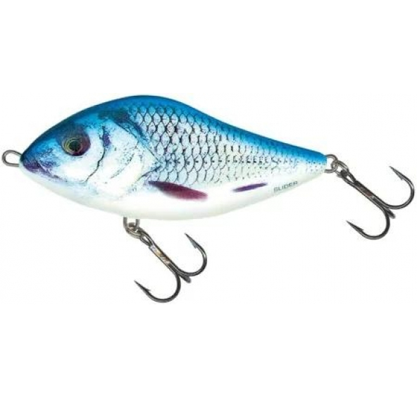Wobler Salmo SLIDER, délka 5 cm, váha 6,5 g, plovoucí, hloubka ponoru 0,5 / 0,5 m, wobler bez lopatky, velkookého tvaru, má 2 trojháčky č.8. Svým pohybem imituje umírající rybku, převaluje se ze strany na stranu a dráždí dravce k útoku.