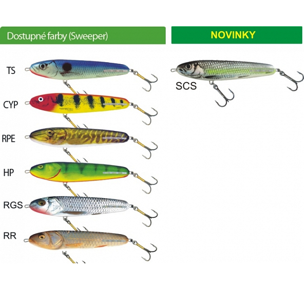 Wobler Salmo SWEEPER, délka 10 cm, váha 19 g, hloubka ponoru 1 m, hladinový potápivý wobler ve tvaru rybky, vhodný na lov na jezerech na lov velkých dravců-štika, sumec. Dá se s ním daleko nahazovat a imituje poraněnou rybu. Má 2 trojháčky č.4.