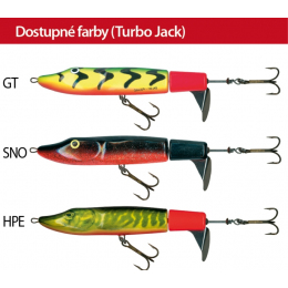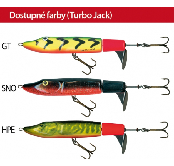 Wobler Salmo TURBO JACK, délka 18 cm, váha 90 g, plovoucí, hloubka ponoru 0,0 m, hladinový wobler ve tvaru štiky, v zadní části s vrtulkou, která čeří vodu, má 2 trojháčky č. 4/0, vhodný na těžkou přívlač na lov štiky a sumců.