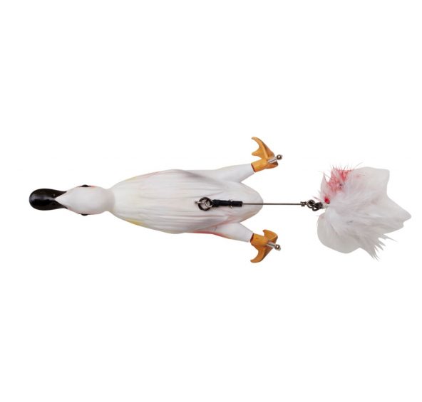 Velice věrná imitace kachny s inovativními prvky! 3D naskenované detaily zajišťují opravdovou věrohodnost, díky které dokáže zmást i ty nejzkušenější predátory a zajistí vám brutální útoky! Pevné ABS tělo a poloměkké odolné nohy. Rotující nohy dávají nástraze neuvěřitelně živou cákavou akci, která zanechává za sebou stopu bublinek, která láká dravce z dálky. Pro lov na volné vodě: 2 kryté opeřené trojháčky, jeden na hrudi a jeden na hřbetu, připojení k tělu zajišťuje dobrou chytlavost háčku. Pro lov v travnaté vodě: odstraňte trojháček na břiše, nástraha je konstruována tak, aby dopadala na dno na břicho, na chycení ryby je připraven trojháček na hřbetu. 2 styly pohybu: při navázání za zobák se pohybuje přikrčeně, jako když se káčátko snaží skrýt a uniknout zároveň, při navázání za hruď se pohybuje výše, jako když panikaří. Nástraha může být vedena rychle i pomalu, s dlouhými i krátkými pulzy, napodobení káčátka bude vždy dokonalé. Skvělá nástraha pro štiky, okouny a velké sumce! Když uvidíte lovit dravce na hladině, napočítejte 10 útoků, navažte sebevražednou kachnu a bojujte!