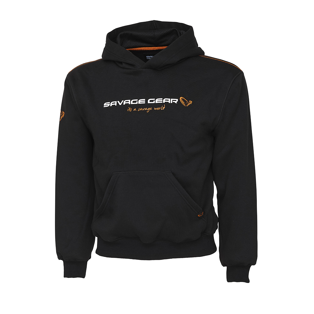 Černa mikina s kapucí a velkou výšivkou s logem Savage Gear na hrudi.