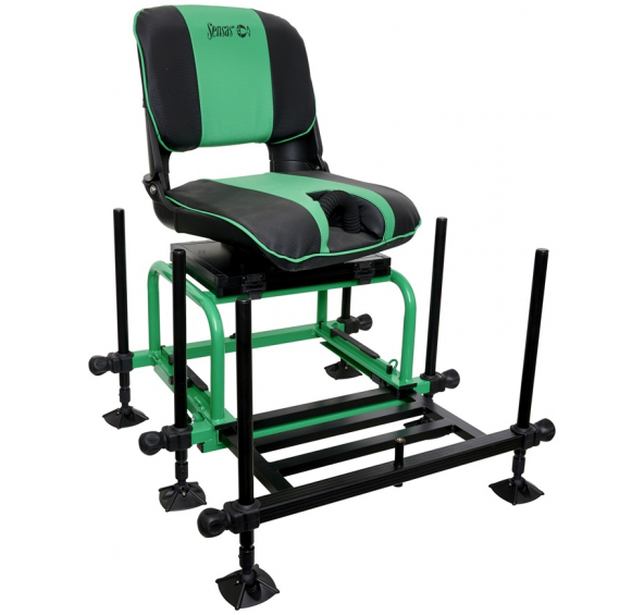 Sedačka pro lov na feeder a plavanou. Obsahuje otočný polstrovaný sedák s opěradlem. Gelová výplň pro pohodlné sezení. Integrovaná kapsa na děličku nebo odložení prutu. Pevná kovová rámová konstrukce. Možnost dokoupení dalších modulů do sedačky. Výsuvné plato pod nohy s držákem vezírku. Pro umístění v terénu je sedačka vybavena 6 kulatými nohami s průměrem 25 mm a širokými patkami proti zapadání. Vodováha pro umístění do roviny. Popruh pro přenášení přes rameno. Rozměry 117x82x58 cm.