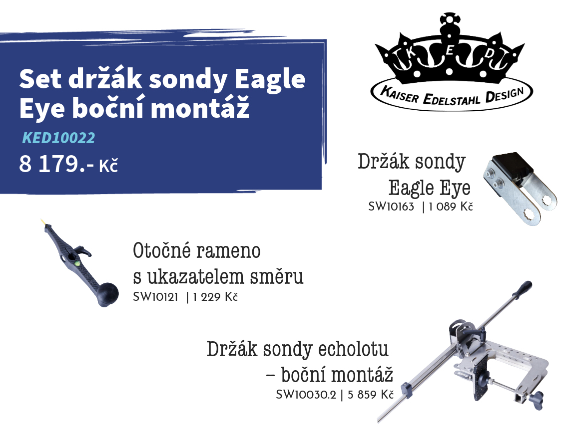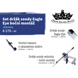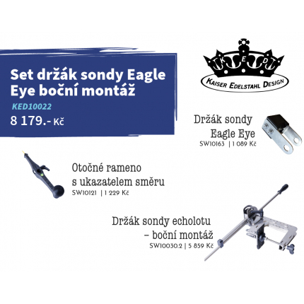 Součástí sestavy je nerezový držák sondy Eagle Eye, držák sondy echolotu s boční montáží a otočné rameno s ukazatelem směru.