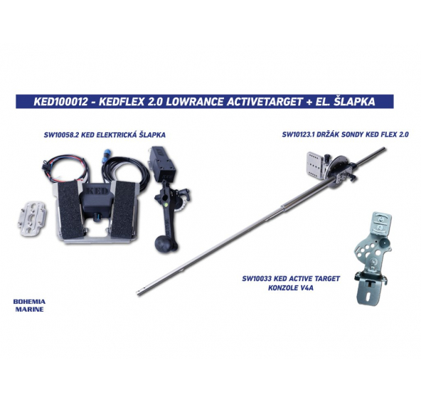 Součástí sestavy je nerezový držák sondy KedFlex 2.0, výměnná konzole Lowrance ActiveTarget a elektrická šlapka.