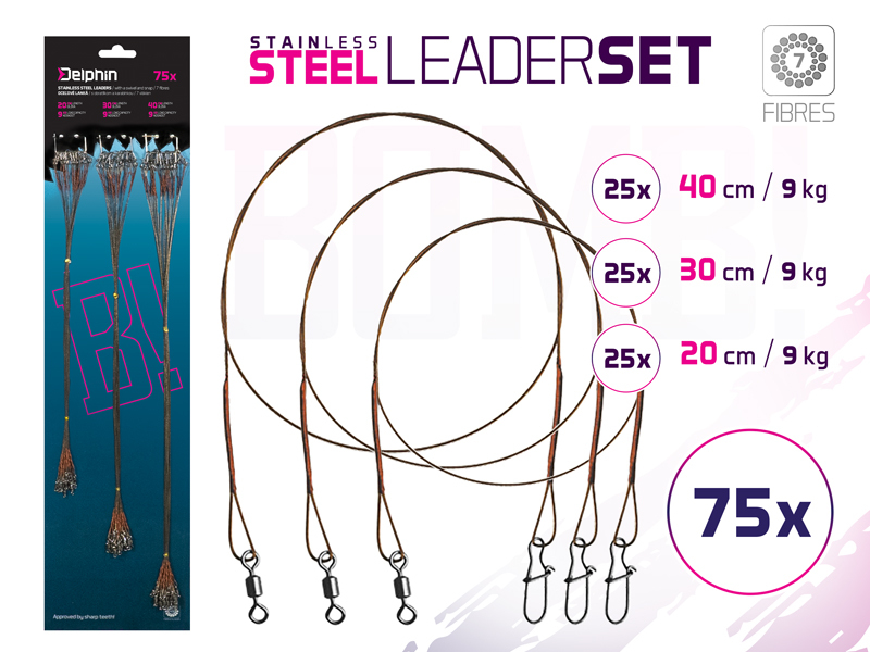 Výhodný set sestávající z oblíbených délek a nosností lanek, z nichž si vyberete vždy to správně na danou situaci během lovu dravých ryb. Oceľové lanko prívlačovej rady BOMB! od značky Delphin je vyhotovené pletením 7 vlákien (označovaných aj ako 1x7) z nehrdzavejúcej ocele. Vyznačuje sa veľmi jemným povrchom a vysokou nosnosťou a odolnosťou voči mechanickému poškodeniu. Lanko je jemné, skvelo sa s ním pracuje a umožňuje dokonalú prezentáciu vašej nástrahy vo vode. Toto lanko neprehryznú ani tie najväčšie vodné predátory! Na jedné straně lanka BOMB! se nachází obratlík a na druhé karabínka. Set ocel. lanek BOMB! S obratl. a karab. / 7 vláken | 75ks/20,30,40cm/9kg Tento výhodný set obsahuje: 25x 20cm/9kg 25x 30cm/9kg 25x 40cm/9kg Velkosti obratlíkov prislúchající k návazcom: 20cm/9kg - obratlík #8, karabínka #0 30cm/9kg - obratlík #8, karabínka #0 40cm/9kg - obratlík #8, karabínka #0 Set ocel. lanek BOMB! S obratl. a karab. / 7 vláken | 75ks/20,30,40cm/12kg Tento výhodný set obsahuje: 25x 20cm/12kg 25x 30cm/12kg 25x 40cm/12kg Velkosti obratlíkov prislúchající k návazcom: 20cm/12kg - obratlík #6, karabínka #1 30cm/12kg - obratlík #6, karabínka #1 40cm/12kg - obratlík #6, karabínka #1 Set ocel. lanek BOMB! S obratl. a karab. / 7 vláken | 75ks/35cm/9,12,15kg Tento výhodný set obsahuje: 25x 35cm/9kg 25x 35cm/12kg 25x 35cm/15kg Velkosti obratlíkov prislúchající k návazcom: 35cm/9kg - obratlík #8, karabínka #0 35cm/12kg - obratlík #6, karabínka #1 35cm/15kg - obratlík #5, karabínka #2