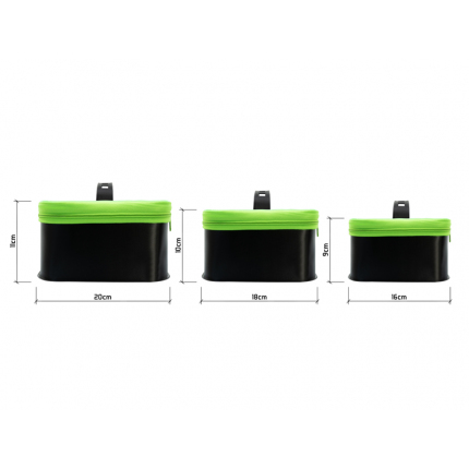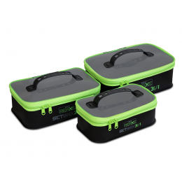 Tašky jsou laděny do černé barvy a jsou opatřeny zipem výrazné zelené barvy, pomocí kterého je lze po celém obvodu uzavřít. Víko je vyrobeno z průhledného materiálu, díky kterému máte dokonalý přehled o tom, co se nachází uvnitř a v jeho vrchní části se nachází praktický úchop sloužící pro transport a snadnou manipulaci. Jsou vyrobeny z pevného a odolného EVA materiálu a v případě, že se vám něco uvnitř rozlije, tuto tekutinu spodní část tašky zadrží. Tašky jsou kompletně voděvzdorné a jsou snadno omyvatelné zevnitř i zvenčí.