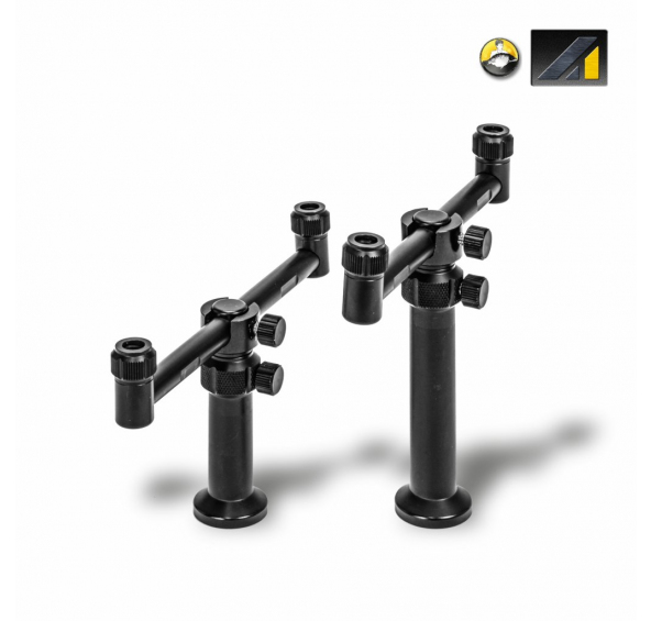 Balení dvou držáků na molo A1 Aluminium Stage Stands, které jsou vhodné pro jakoukoli dřevěnou plochu nebo dřevěné molo.