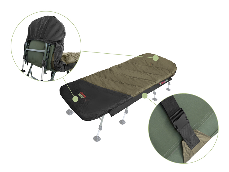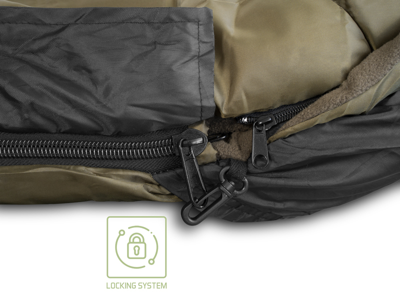 Všechny vnitřní vrstvy jsou tvořeny měkkým fleecem hnědé barvy, který je příjemný na dotek a také výjimečně hřejivý, takže se budete cítit komfortně i v extrémní zimě. Hlavní zip po obou stranách je mohutný, pevný a nezasekává se, čili pokud budete mít záběr, stačí potáhnout vrchní vrstvu a můžete utíkat za rybou. Zip na druhé straně si můžete zafixovat pomocí plastové pojistky ve tvaru spony. Mezi každou vrstvou se nacházejí další jemnější zipy umožňující využití kterékoli z vrstev dle vnějších podmínek a Vaší osobní preference. Všechny zipy jsou překryty lemem nepromokavé látky, a tím pádem chráněny před deštěm. V hlavové části se nachází kapsa vhodná pro umístění a uzavření jakéhokoli menšího polštáře.