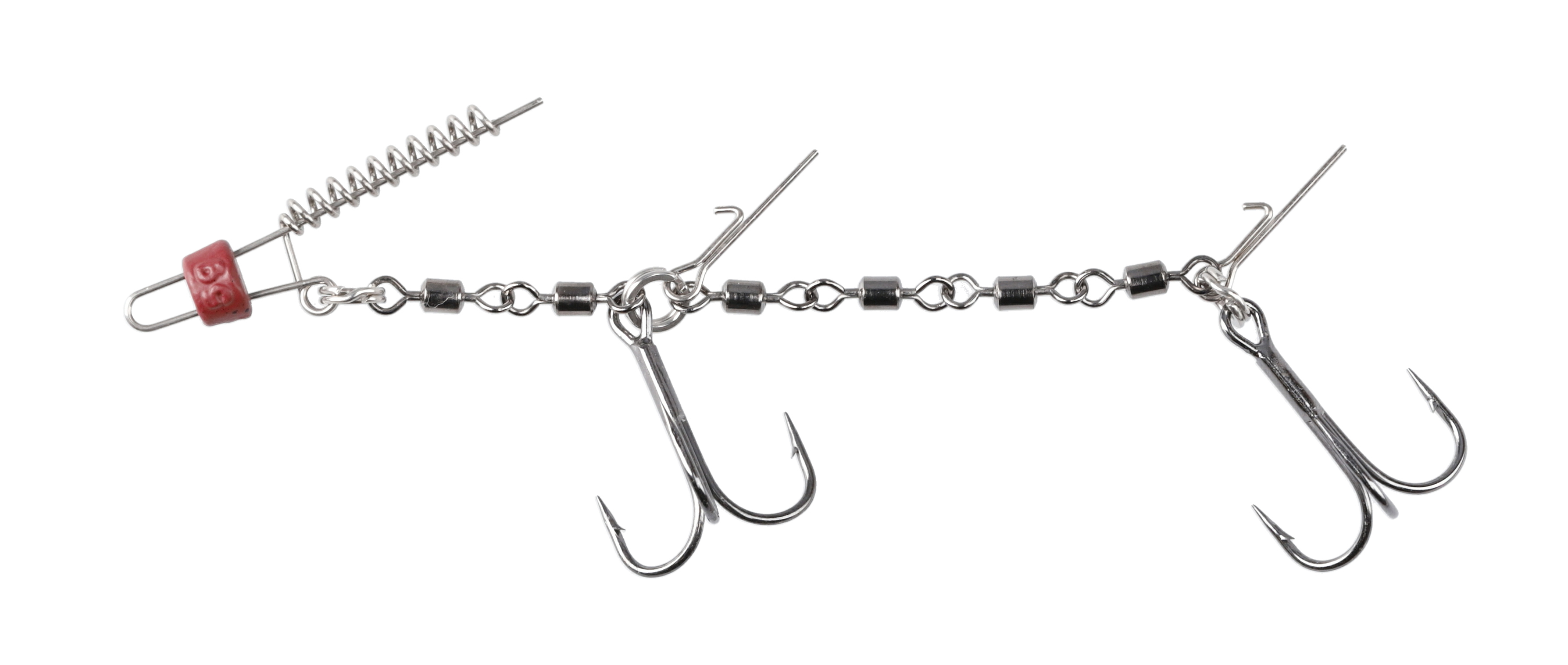 Moderní stinger systém se zavrtavacím šroubem, vyrobený z obratlíků, který umožňuje velmi pevné spojení. Další výhodou je možnost změnit váhu nástrahy bez její zničení.