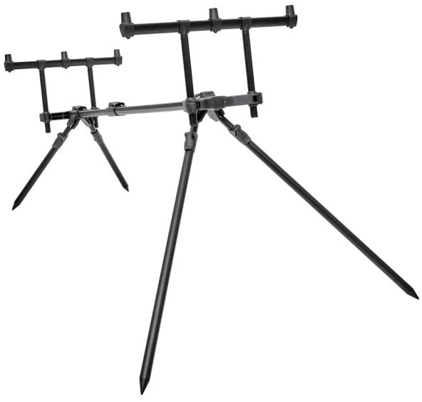 Stabilní a pevný stojan pro čtyři pruty. Snadné rozložení a složení. Vysoká stabilita v nerovném terénu. 4 teleskopické nohy pro maximální variabilitu v terénu, výškově nastavitelné hrazdy se snadným systémem skládání, nastavitelná délka stojanu. Stojan je vyroben z odlehčené, ale přesto velmi pevné slitiny. Dodáváno s transportním obalem. Rozměr ve sbaleném stavu 95x33 cm, délka stojanu 93-110 cm, výška 65/85 cm, výsuv hrazd 45/60 cm, délka hrazd 56 a 69 cm, délka nohou 30/50 cm a 60/108 cm, váha 1800 g.