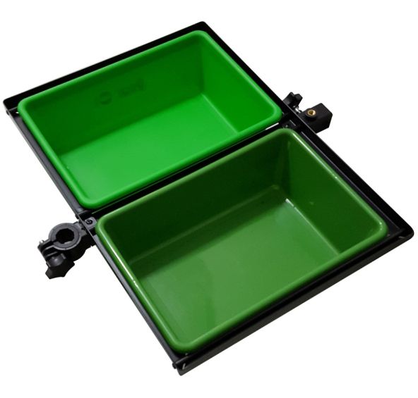 Stoleček na dvě menší misky na nástrahy a krmení. Pasuje na kulaté nohy 25-30-36 mm. Rozměr 51x41 cm.