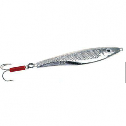 Stříbrný pilker Ice Fish s trojháčkem používaný při pilkrování v Nrorsku.