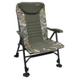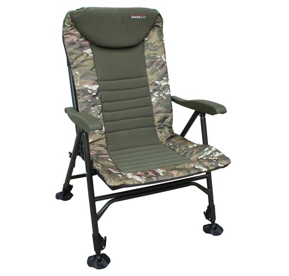 Pohodlné a exkluzivní rybářské křeslo v CAMO provedení s anatomicky tvarovanou matrací s micro fleece. Opěradlo má pohodlný polštář a na bocích matrace je lem camo 600D oxford, chránící před větrem a zimou. Konstrukce křesla je ocelová o tloušťce stěny 2mm a velmi jednoduchá, pevná s nosností až 160kg, jeho rozložení či složení je otázkou několika vteřin. Pevné područky slouží k naklápění opěradla při jejich nadzdvižení (8 poloh). Teleskopické nohy jsou vybaveny spolehlivou aretací a protiskluzovými packami proti zaboření. Výška sedáku 40 - 56 cm bude pro mnohé velkou výhodou, při častém vstávání k prutům.