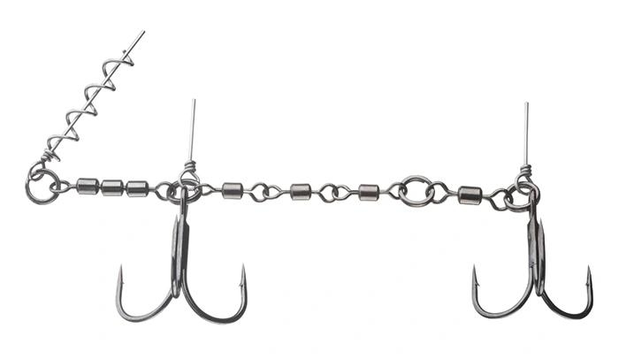 Šroubovací systém s obratlíky a kroužky. Připraven k rybolovu a okamžitě použitelný. Trik systému spočívá v tom, že díky obratlíkům je pro rybu obtížnější zbavit se háčku během zdolávání. Navíc lze tento systém přesně přizpůsobit velikosti nástrahy přidáním nebo odebráním obratlíků, resp. dělicích kroužků. Hmotnost obratlíku navíc stabilizuje akci ...