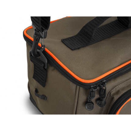 Přístup do hlavního úložného prostoru poskytuje kvalitní zip s taháčky a s logem značky Delphin. Víko tašky z vnitřní strany navíc ukrývá zipovatelnou kapsu ze síťoviny pro uložení drobné rybářské bižuterie nebo dokladů. Kromě toho taška nabízí další ukládací prostor ve formě zipovatelné kapsy na přední straně. Protože u všech našich produktů dbáme na detaily, i u tašky Easy XL jsme na obou stranách tašky přidali poutka pro vložení peanu nebo kleští. Tašku lze pohodlně přenášet pomocí kvalitního, odepínatelného, délkově nastavitelného popruhu pro nošení přes rameno, nebo pomocí textilní rukojeti umístěné na víku.