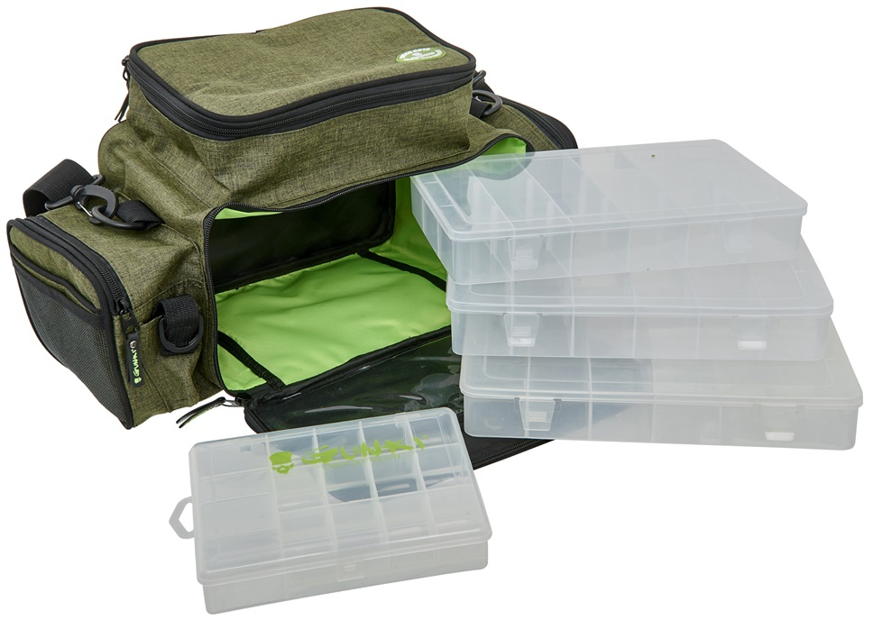 Taška pro uskladnění všeho potřebného na přívlač. Taška obsahuje hlavní komoru, tři vnější kapsy na zip, dvě síťové kapsy a držák kleští. Součástí hlavní komory jsou tři krabičky na nástrahy o rozměrech 27,5×19,5×4,5 cm. Horní komora navíc obsahuje krabičku na nástrahy 20×13,5×4 cm, která je velmi praktická pro uspořádání drobného příslušenství. Po...