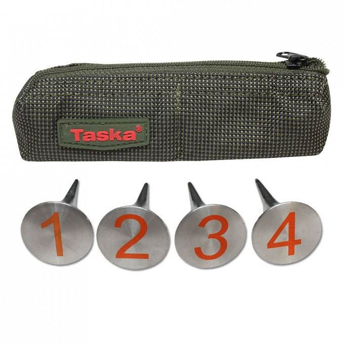 Balení obsahuje 4 nerezové kolíky s číslicemi 1 až 4, ty jsou uloženy v praktickém zeleném pouzdře. Kolíčky jsou vytvořeny pro použití s tyčkami Spot on Sticks. Pomocí těchto kolíků si na zemi označíte přesné místo a zároveň číslo prutu, který tomuto místu odpovídá. Pouzdro s kolíkami lze připnout k pouzdru s tyčkami Spot on Sticks.