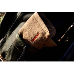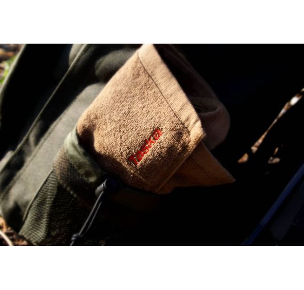 Hnědý a jemný ručník od Tasky má ideální velikost, nezabere příliš prostoru a je ideální součástí výbavy každého kapraře. Na ručníku je vyšité malé červené logo Taska.