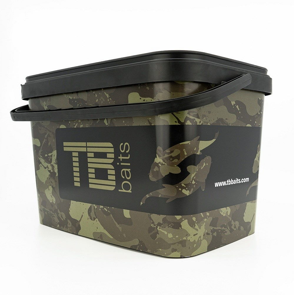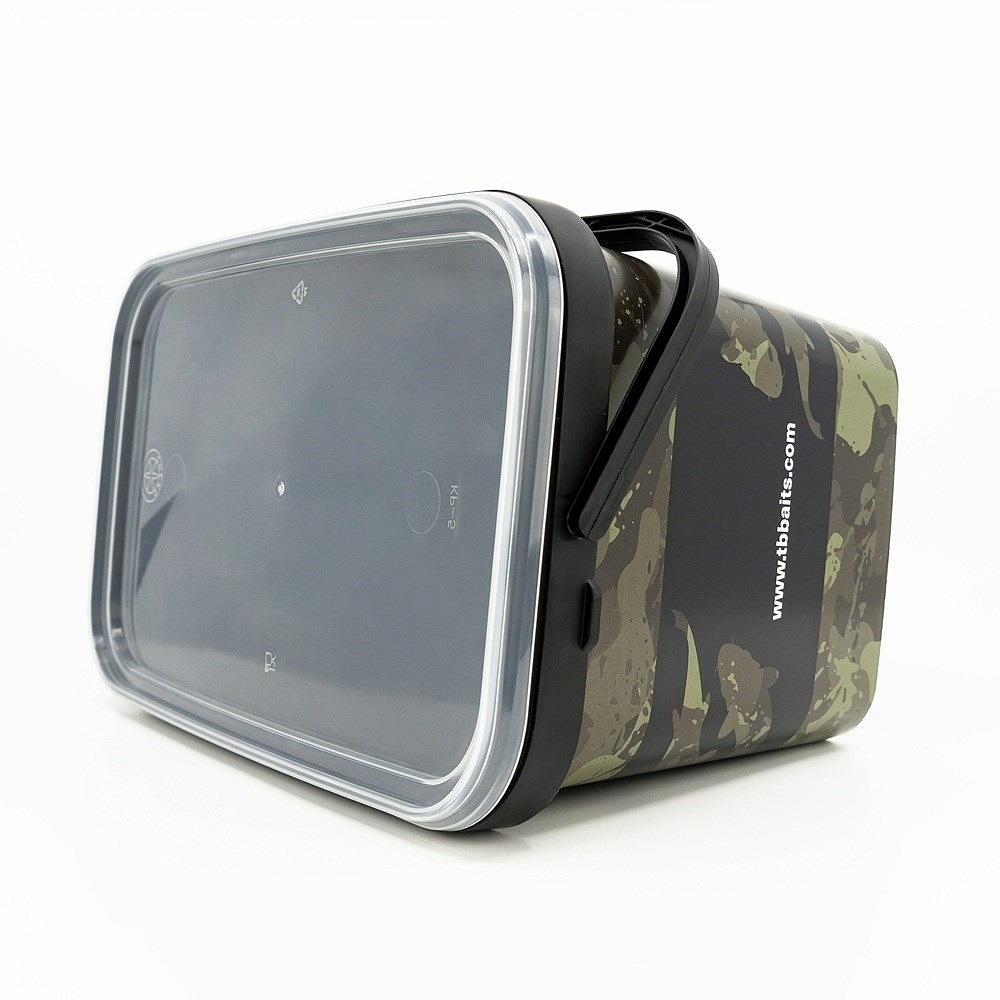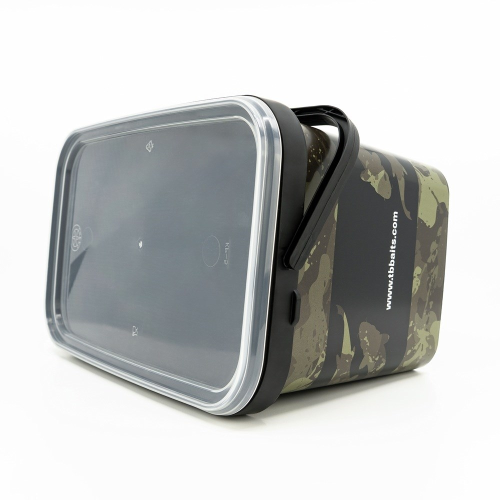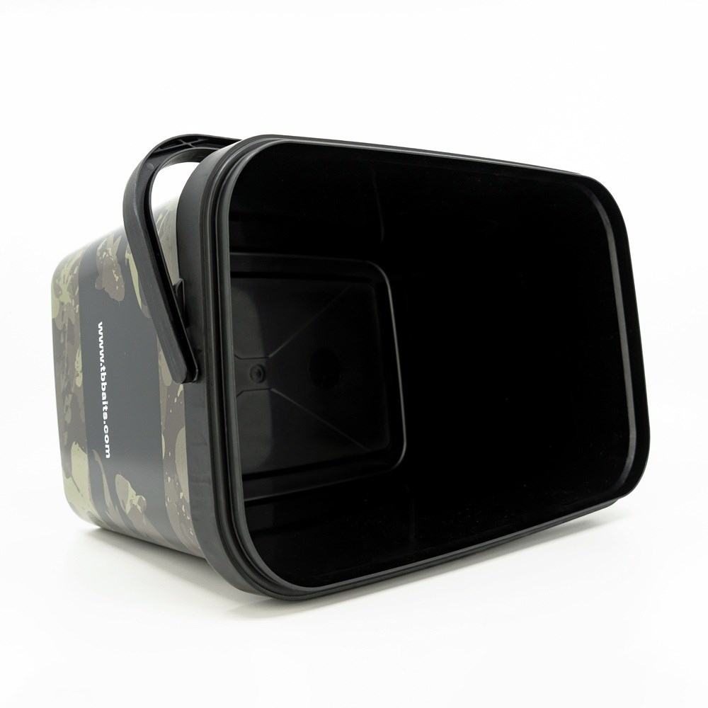 Plastový kbelík obdélníkového tvaru v designu Camo Carps od značky TB Baits.