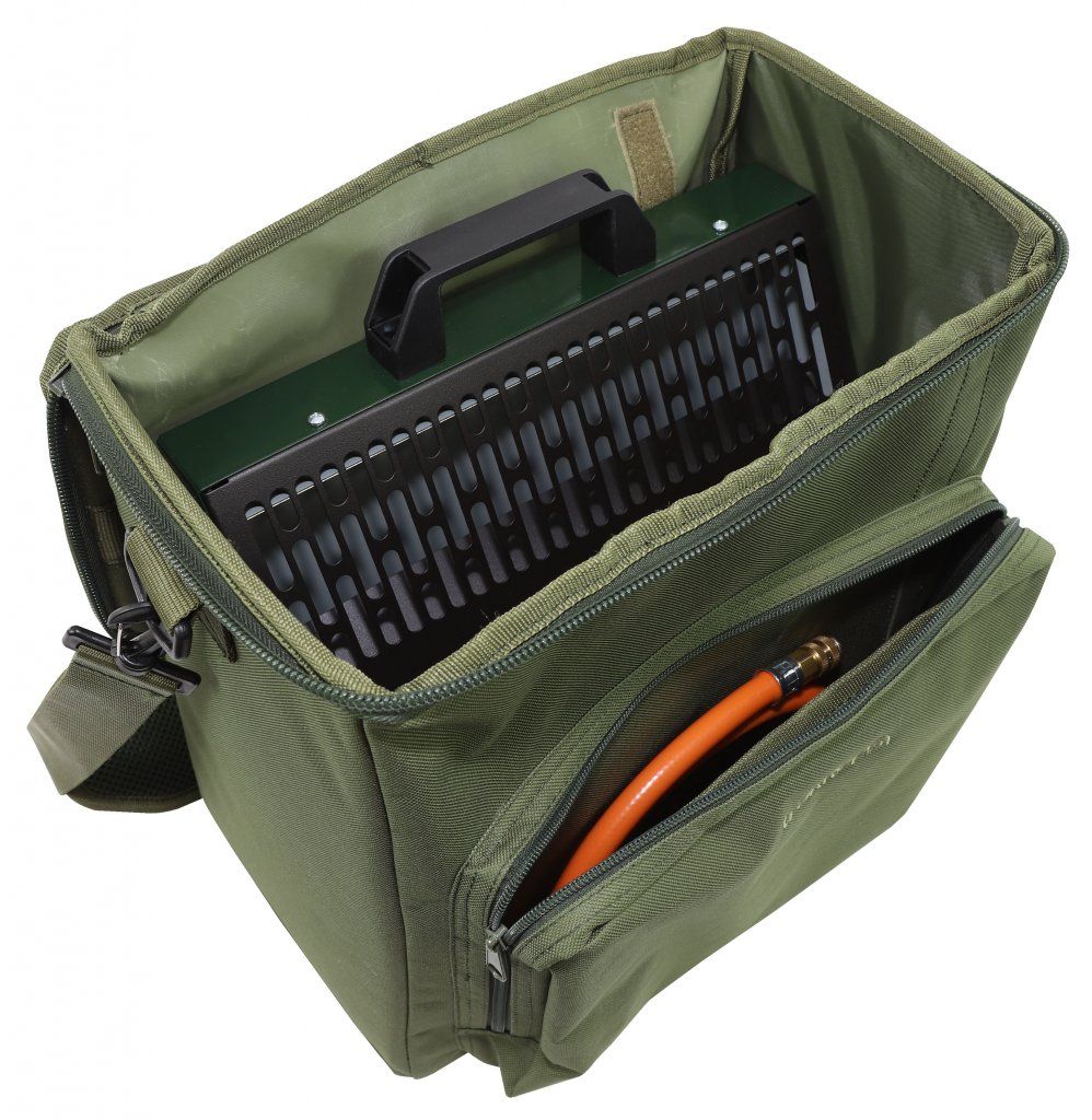 Na přední straně se nachází velká kapsa na zip, která se perfektně hodí například k uložení hadic a dalšího potřebného příslušenství. Obal je vyroben z našeho proslulého materiálu 600D NXG. Spodní strana je pokryta materiálem Nyplax, který je voděodolný a umožňuje jednoduché očištění. Strany a dno byly vyztuženy pro dosažení maximální ochrany předmětů uložených uvnitř. Dále se může obal pochlubit vyztuženým madlem pro jednoduchou manipulaci a odnímatelným vypolstrovaným ramenním popruhem.