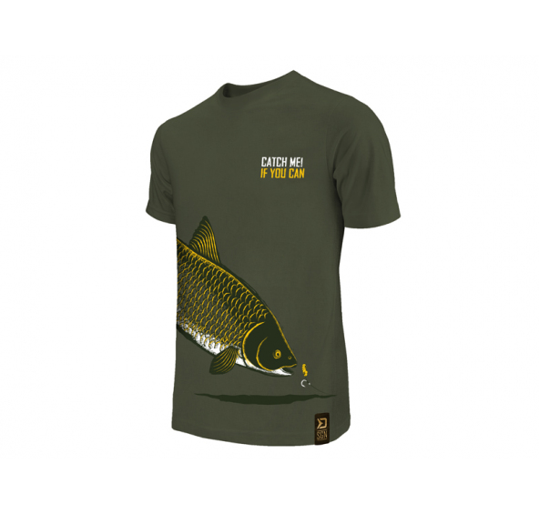 CATCH ME IF YOU CAN (chyť mě, pokud to dokážeš) se nepochybně stane jedinečným kouskem každého rybářského šatníku, díky kterému se u vody odlišíte. Triko Catch me! AMUR je designováno v tmavě zelené barvě s vyobrazením krmícího se amura, což jistě potěší příznivce lovu těchto ryb. Samotné tričko je vysoké kvality, stejně jako použitý barevný tisk.