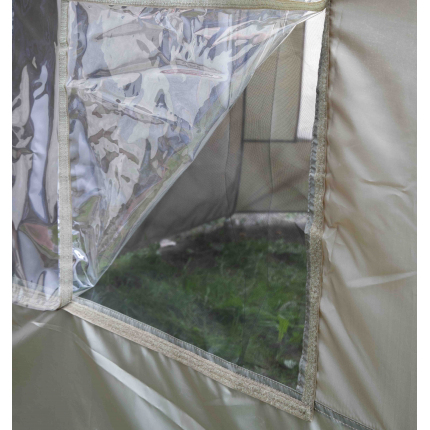 Průměr měřený podél vrchlíku je 3 m. Vyrobeno z voděodolného materiálu s podlepenými švy, nastavitelným úhlem a bočními stěnami. Okna s moskytiérou zajišťují větrání v horkých dnech.