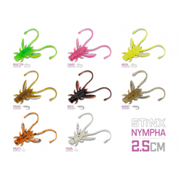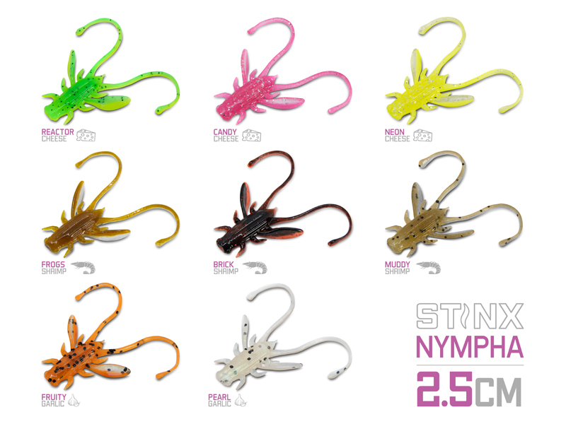 Ultralehká přívlač si získává stále větší popularitu, což nezůstalo bez odezvy u týmu značky Delphin. Výsledkem je umělá nástraha Delphin B! Stinx NYMPHA. Jedinečný tvar nástrahy navržený našimi designéry představuje originální kombinaci vodního hmyzu a korýše, díky čemuž ve vodě působí mimořádně realisticky a přirozeně. Detailně propracované tělo spolu s dlouhými nožičkami vytváří neodolatelný pohyb, kterému jen těžko odolají pstruzi, okouni, jelci, ale i další druhy, jako například bílé ryby. Nástraha je vyrobena z kvalitního měkkého materiálu a obsahuje sůl, což zvyšuje její atraktivitu a zajišťuje, že na ni ryby opakovaně a s chutí útočí. Pro ještě větší účinnost je dostupná ve třech osvědčených příchutích – kreveta, česnek a sýr. Nástrahy jsou navíc uloženy v praktické nádobě s tekutým atraktorem, do kterého lze uložit použitou nástrahu, a tak opětovně zvýšit její atraktivitu. Technické parametry: Hmotnost nástrahy: 0,90 g