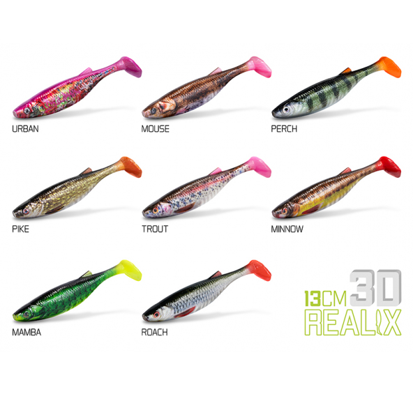 Delphin Realix 3D je měkká umělá nástraha typu paddle tail, která ve vodě dokonale imituje malou rybku. Její velikost je přizpůsobena lovu větších dravců, jako jsou štika, candát nebo sumec. Jak už název napovídá, jejím hlavním poznávacím znakem je realistický potisk, díky kterému jsou na jejím povrchu zobrazeny i ty nejmenší detaily. Realistický vzhled podtrhují výstupky a prohlubně napodobující žebra, žábrové oblouky či samotné ploutve. Aby byla nástraha ještě lákavější a viditelnější, její ocásek je zabarven UV aktivními barvami. Během vedení nástrahy ocásek výrazně kmitá ze strany na stranu, přičemž vytváří intenzivní vibrace dráždící smysly dravců. Nástraha skvěle pracuje i při pomalém vedení a při použití lehkých závaží. Barevná provedení nástrahy důvěrně imitují různé druhy ryb, jako je štika, pstruh nebo okoun. V nabídce však naleznete i netradiční barevné varianty napodobující myš, hada nebo růžovou kombinaci se vzorem grafity pod názvem Urban. Materiál se vyznačuje mimořádnou odolností a trvanlivostí, díky kterým nástraha vydrží opakované útoky predátorů. Dokonalé realistické zpracování a bezvadný pohyb nástrahy dokáží oklamat i ty nejopatrnější predátory a vám zaručí časté záběry při vašich toulkách za dravci. Technické parametry: Hmotnost nástrahy: 16g