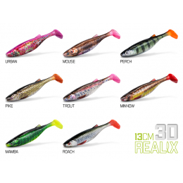 Delphin Realix 3D je měkká umělá nástraha typu paddle tail, která ve vodě dokonale imituje malou rybku. Její velikost je přizpůsobena lovu větších dravců, jako jsou štika, candát nebo sumec. Jak už název napovídá, jejím hlavním poznávacím znakem je realistický potisk, díky kterému jsou na jejím povrchu zobrazeny i ty nejmenší detaily. Realistický vzhled podtrhují výstupky a prohlubně napodobující žebra, žábrové oblouky či samotné ploutve. Aby byla nástraha ještě lákavější a viditelnější, její ocásek je zabarven UV aktivními barvami. Během vedení nástrahy ocásek výrazně kmitá ze strany na stranu, přičemž vytváří intenzivní vibrace dráždící smysly dravců. Nástraha skvěle pracuje i při pomalém vedení a při použití lehkých závaží. Barevná provedení nástrahy důvěrně imitují různé druhy ryb, jako je štika, pstruh nebo okoun. V nabídce však naleznete i netradiční barevné varianty napodobující myš, hada nebo růžovou kombinaci se vzorem grafity pod názvem Urban. Materiál se vyznačuje mimořádnou odolností a trvanlivostí, díky kterým nástraha vydrží opakované útoky predátorů. Dokonalé realistické zpracování a bezvadný pohyb nástrahy dokáží oklamat i ty nejopatrnější predátory a vám zaručí časté záběry při vašich toulkách za dravci. Technické parametry: Hmotnost nástrahy: 16g