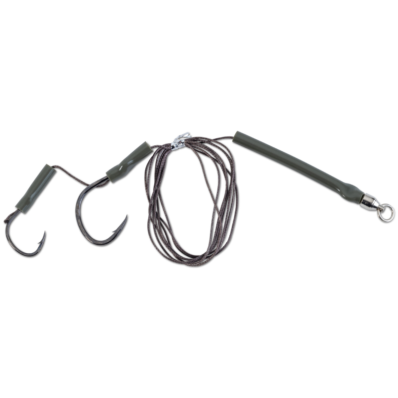 Celý popisTento ručně vázaný návazec je určený pro cílený lov sumců s použitím živých nebo mrtvých nástrah, rousnic nebo kousků kalamárů. Jednoháčky SX-67 Kona ve velikostech 5/0 + 2/0 zaručují vysokou pevnost a spolehlivost při záseku i zdolávání. Díky kuličkovému obratlíku je zajištěn hladký chod a eliminace kroucení vlasce. Odolný materiál návazce chrání proti oděru i v těch nejnáročnějších podmínkách.