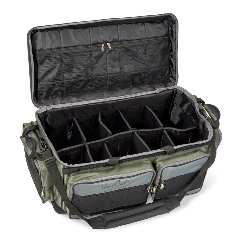 Celý popisDo této velké sumcové tašky se vejde neuvěřitelné množství náčiní. Nejen, že jsou boční části vyztužené, ale víko je vyrobeno z pevného materiálu a působí dojmem truhly. Hlavní kapsu lze rozdělit přepážkami, které se jednoduše připevní suchým zipem. Dále je taška vybavena bočními madly, hlavním madlem a ramenním popruhem.