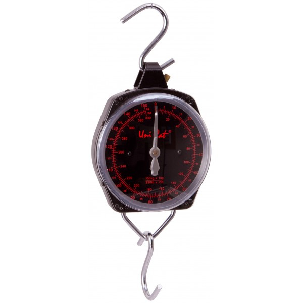 Spolehlivá váha na větší ryby. Elegantní černo-červená optika má stupnice v librách nebo v kilech. Váží až do 150kg. Nahoře má nerezový hák k zavěšní váhy, dole potom hák na zavěšení vážícího saku. Váha je v ochranném pouzdru.