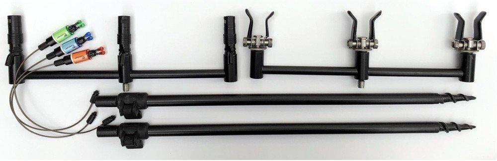 Speciální set v tašce s dvěma ramínky a teleskopickými zavrtávacími vidličkami určený pro 3 indikátory. Set je plně vybavený a obsahuje:~3x zadní pérová rohatinka, 3x adaptér pro indikátor, 3x swinger na "věčné" světlo, odnímatelné závaží. Všechny komponenty jsou kvalitně zpracované.~šířka ramínka: 30cm~zavrtávací vidlička: 52-87cm