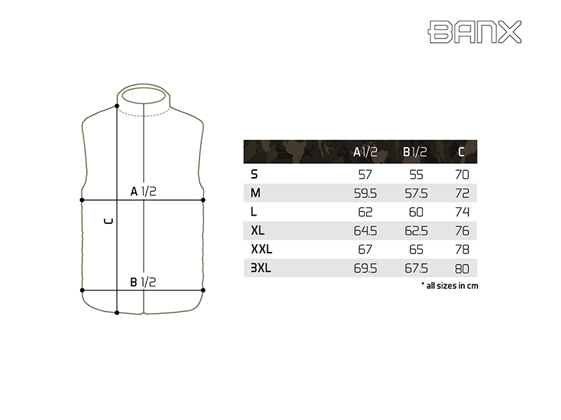 Zateplená vesta přinášející skvělý tepelný komfort během chladných, podzimních či zimních dní. Je vyrobena z tkaniny, která je příjemná na dotek a zároveň snadno udržovatelná, což je velmi praktické při použití během rybolovu a jiných outdoorových aktivitách. Vesta je zároveň příčně prošívaná, což vytváří stylový vizuální prvek produktu. Výplň vesty je extra lehká a zajišťuje výborné termoizolační vlastnosti. Zapínání je zajištěno pomocí kvalitního zipu, překrytého z vnější strany tkaninou, což zvyšuje jeho odolnost vůči vnějším podmínkám. Na obou stranách se nacházejí dostatečně velké kapsy na ruce nebo pro odložení potřebného příslušenství. Vesta Banx disponuje také vyvýšeným límcem pro lepší překrytí krku a šíje při nízkých teplotách vzduchu. Design se skládá z černé barvy, kterou stylově doplňuje naše patentovaná kamufláž BANX. Díky této kombinaci ji můžete využít nejen při rybolovu, ale také k běžnému nošení. Podle přiložené velikostní tabulky si prosím zkontrolujte vyhovující velikost. Materiálové složení: 100% Polyester Pojem BANX vyjadřuje patentovanou kamufláž z dílny značky Delphin, která v sobě nese hluboký vzkaz. Jedinečné designové prvky, ze kterých je složená, jí dodávají nezaměnitelný charakter a dělají z ní více než jen vizuální vzor. Kamufláž BANX zobrazuje přesně to, co spojuje naši rybářskou vášeň napříč celou Evropou. Jsou to jezera, řeky či jiné vodní plochy. Od vod rumunského pobřeží, přes vodní nádrže na Slovensku až po ikonická jezera Evropy napříč Německem, Itálií až po úplný západ Evropy ve Španělsku. Právě siluety těchto jezer jsme spojili a vytvořili tak jedinečnou kamufláž s názvem BANX. Není to jen kamufláž - je to mapa. Mapa, která svým precizním designem zobrazuje ty nejznámější revíry Evropy, díky nimž bude vaše výbava vypadat maximálně jedinečně a originálně.
