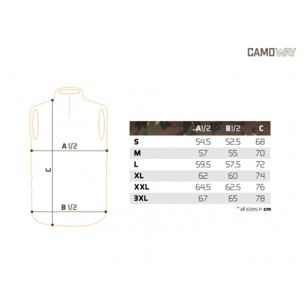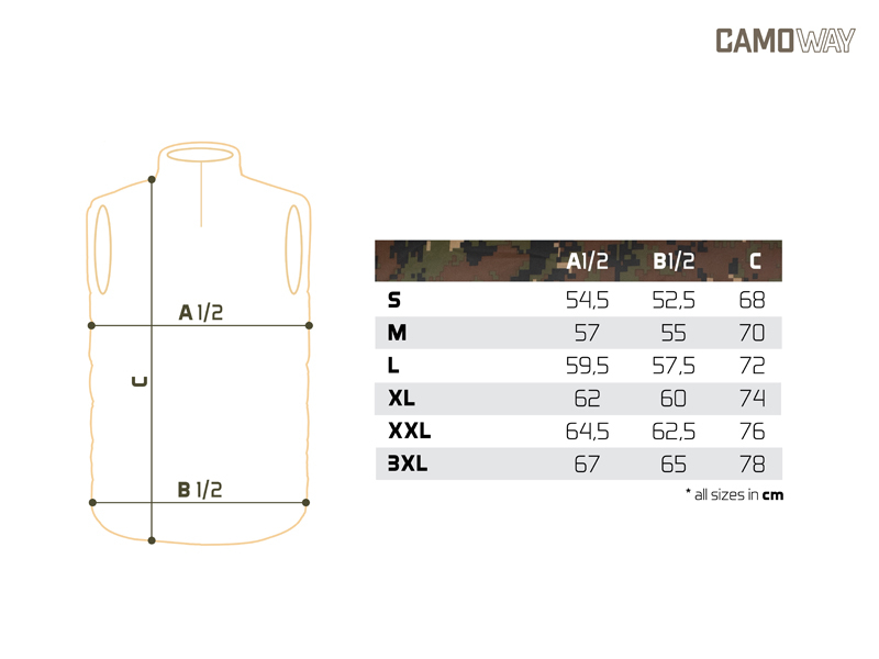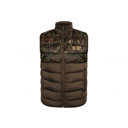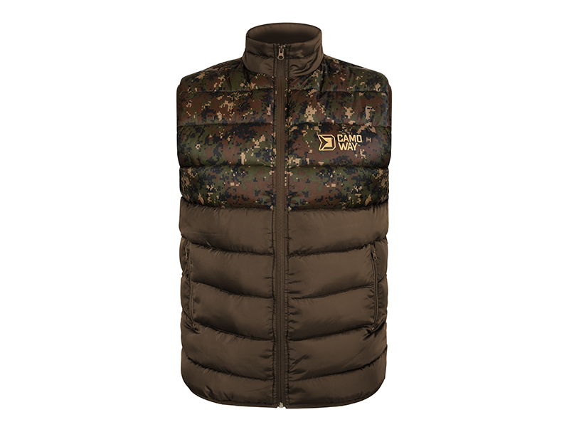 Zapínání je zajištěno pomocí kvalitního zipu, překrytého z vnější strany tkaninou, což zvyšuje jeho odolnost vůči vnějším podmínkám. Na obou stranách se nacházejí dostatečně velké kapsy na ruce nebo pro odložení potřebného příslušenství. Vesta CamoWAY disponuje také vyvýšeným límcem pro lepší překrytí krku a šíje při nízkých teplotách vzduchu.