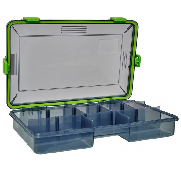 Vodotěsná krabička na nástrahy s nastavitelnými přihrádkami.