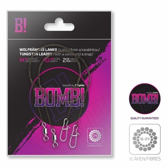 Na jedné straně wolframového lanka BOMB! se nachází obratlík a na druhé karabinka, které jsou uložené ve smyčkách. V každém balení se nachází až 2 kusy tohoto odolného lanka!
