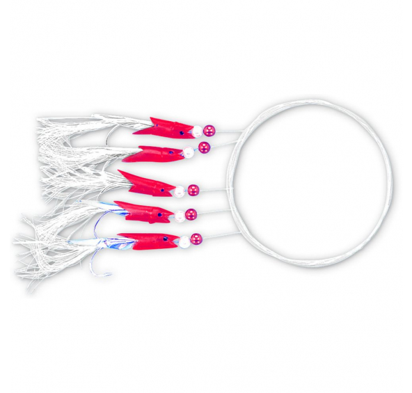 S 5 červenými plastovými rybkami s třpytivými vlákny navázanými na háčcích velikosti 2/0. Průměr návazce 0,50