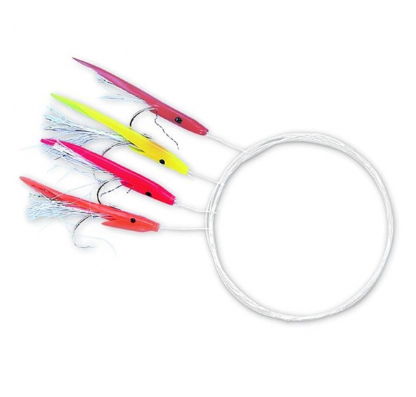 Se 4 barevnými plastovými rybkami s třpytivými vlákny navázanými na háčcích velikosti 3/0.