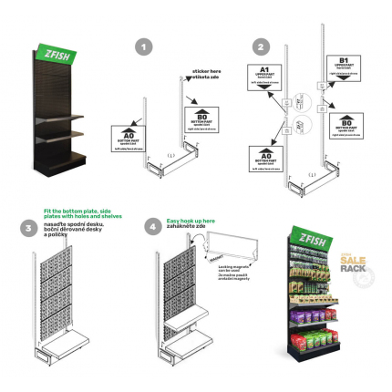 ZFISH Stojan Sales Rack je pevný a stabilní prodejní regál, který je ideálním pomocníkem pro naprosto dokonalou prezentaci našich nových vymazlených produktů prémiové řady "3FISH". Nekompromisní kvalita materiálu a zpracování těchto stojanů spolu s elegantním černo-zeleným ZFISH designem zajistí, že se na Vaší prodejně rozhodně neztratí a jsme si jistí, že neunikne pozornosti žádného zákazníka. Regál disponuje velkou děrovanou plochou k zavěšení produktů na klasické prodejní háčky, a je dále opatřen dvěmi libovolně umístitelnými policemi a i samotná podstava tvoří polici a umožňuje vystavit další produkty. Součástí balení těchto ZFISH regálu jsou samozřejmě i samotné závěsné háčky. Stojany jsou samozřejmě navržené a vyrobené tak, aby šli snadno propojit a seskládat vedle sebe.